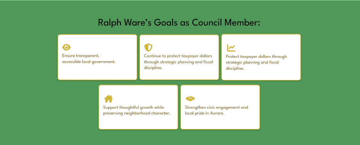 Ralph Ware is already a successful entrepreneur running Warehouse Industries and Real Property Management Valor decided to run for City Council At Large for the City of Aurora. He has already done most of the branding work, including selecting the colors and designing the logo.
